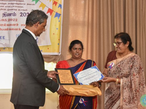 International women’s day -2022 was celebrated on the 8 th of March 2022 at the training center of District Secretariat Kilinochchi. Prof.S.Srisatkunarajah, Vice-chancellor, University of Jaffna was the chief guest, and Mrs.R.Keetheeshwaran, Government Agent, Killinochchi was the special guest of this event. Director and the members of the CGEE University of Jaffna, Staff of the District Secretariat, Killinochchi, women development officers, Community Based organizations, JSAC representatives, UNHCR representatives, and the public participated in this event. The selected women who struggled, faced life challenges, succeeded, and contributed to the social and economic development of their village were appreciated and recognized via the ‘successful women’ award 2022. Prizes for the women contest winners who participated and won the first three places in Art, Poetry writing, Karam, Thachchy, the musical chair held on 4th of march were given on the same day. There was an exhibition of products made by the women entrepreneurs of the Kilinochchi district.